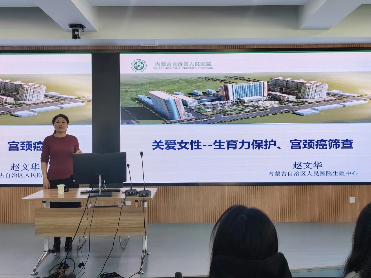 内蒙古自治区人民医院生殖中心赵文华副主任为同学们科普了生育力保存的相关知识以及宫颈癌的预防,特别提醒了同学们要好好保护自己的身体,养成健康科学的饮食习惯和生活方式;同时还建议女生要在合适的年龄去进行二价、四价、九价疫苗的接种,最大程度的保护自己不受HPV病毒的伤害。