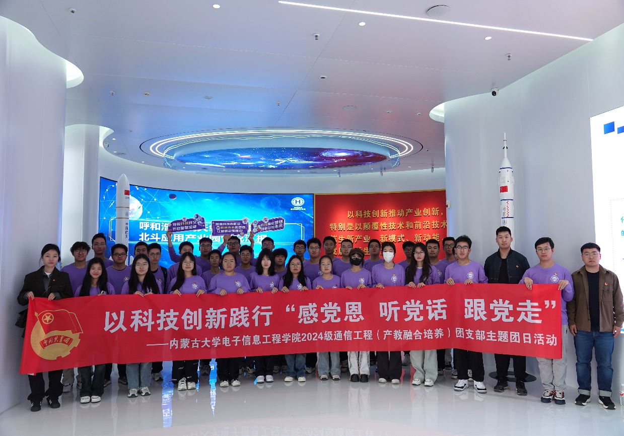 为贯彻落实全国教育大会精神,提高学生创新能力,深化产教融合、科教融汇,按照学院“青创EIE”第二届科技创新文化节的安排,太阳集团tyc97282024级通信工程(产教融合培养)团支部于2024年10月31日下午3:00前往内蒙古北斗应用产业园开展“以科技创新践行‘感党恩 听党话 跟党走’”主题团日活动。