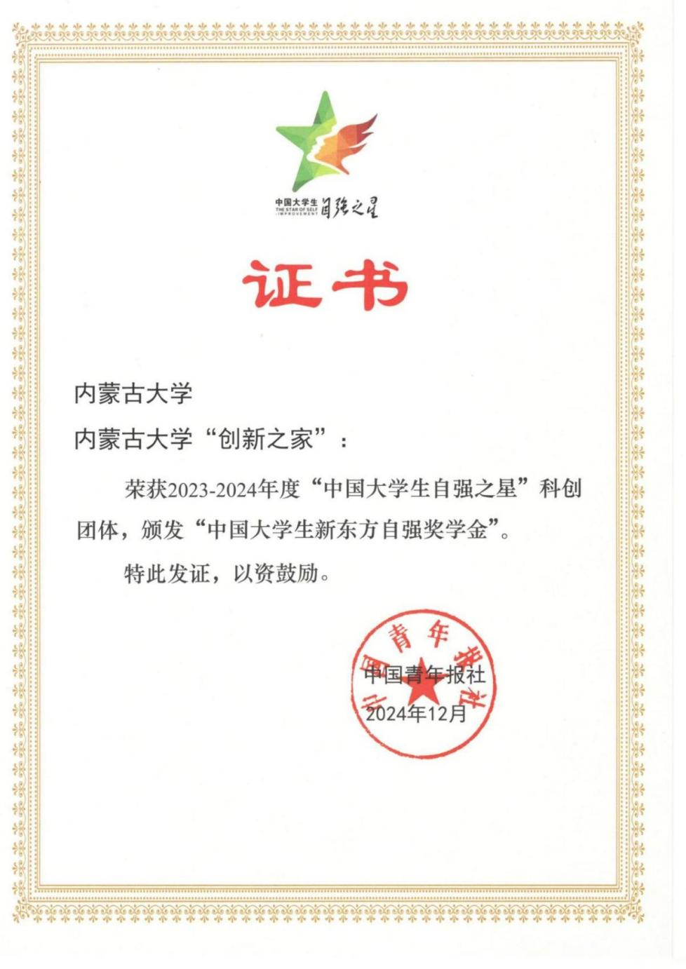 近日,由共青团中央、全国学联指导开展的2023—2024年度“中国大学生自强之星”奖学金评选结果揭晓。太阳集团tyc9728“9728太阳集团‘创新之家’团队”获评2023—2024年度首届“中国大学生自强之星”科创团体,全国仅有100个大学生创新团队获此殊荣。