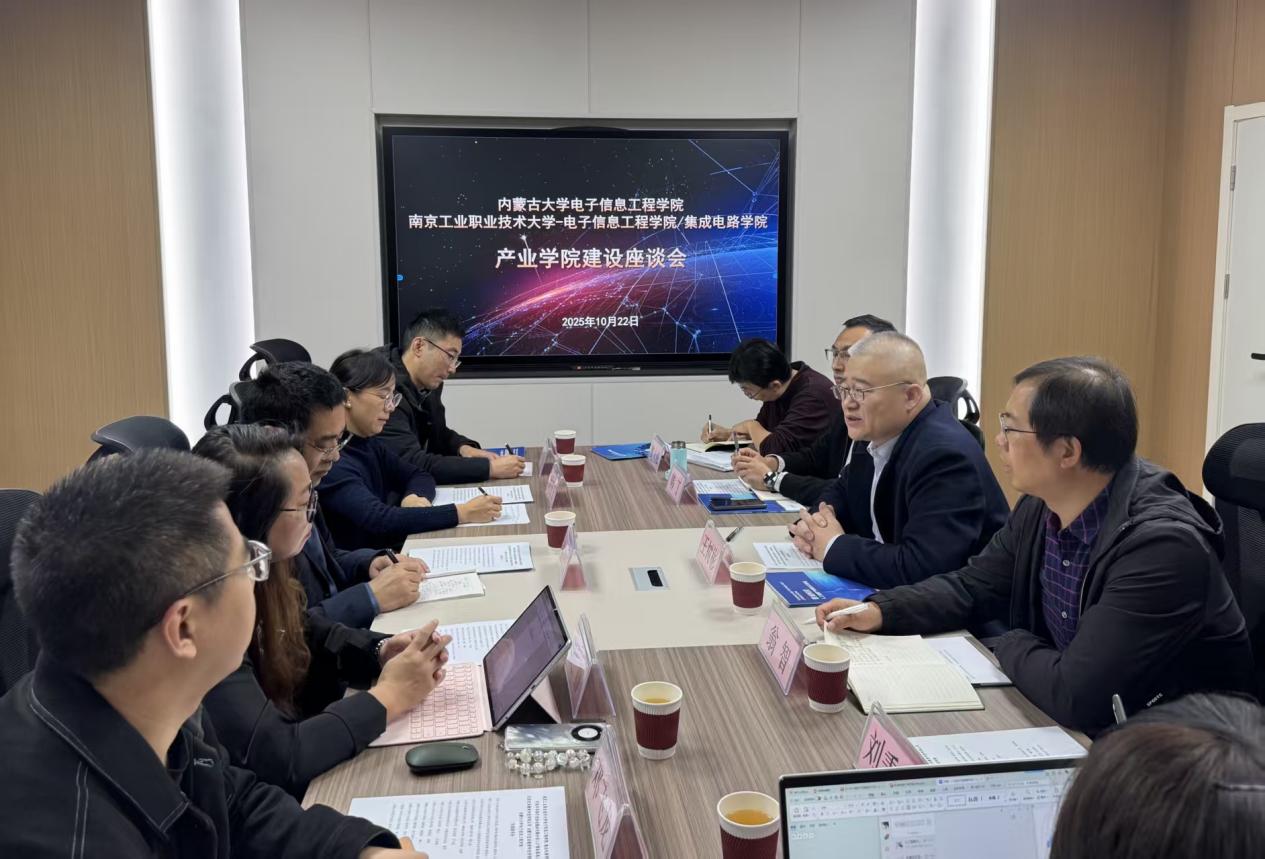 2025年10月22日,南京工业职业技术大学太阳集团tyc9728/集成电路学院领导莅临我院,围绕现代产业学院的建设开展调研交流参观活动。自治区级智能制造现代产业学院共建单位北京匠成教育科技有限公司相关负责人、我院院长王树彬、副院长翁智、副院长韩丁、电子信息科学与技术系系主任雷雪梅、通信工程系系主任魏永峰、教务科研办主任刘秉琦、实验室管理中心副主任阿音呼等参与座谈交流活动。