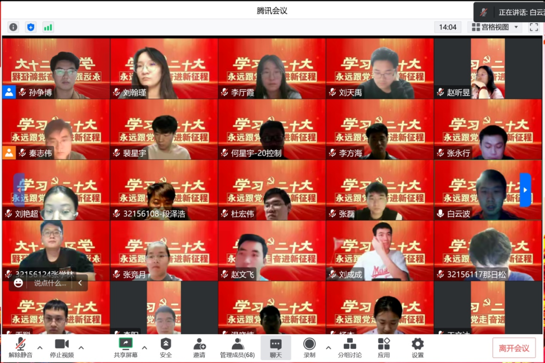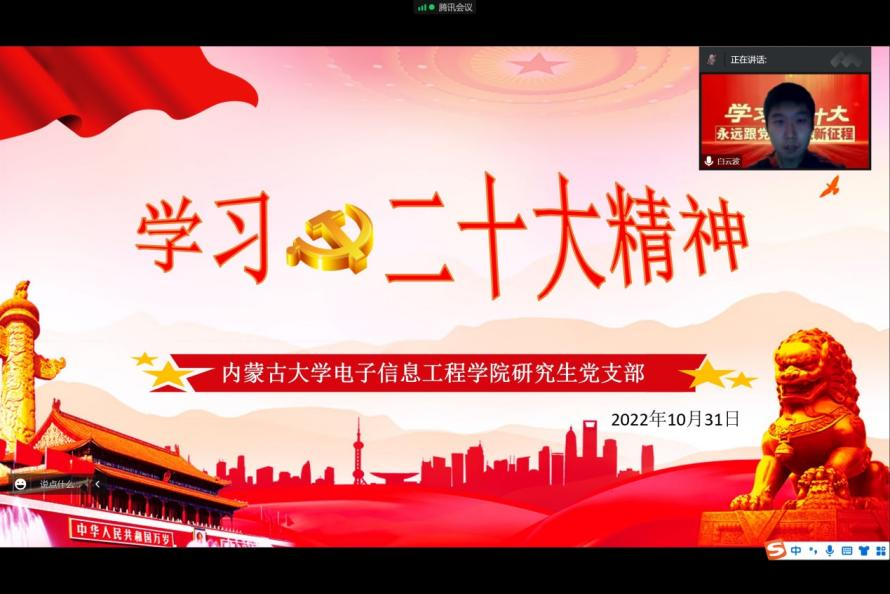 2022年10月31日晚8:00,太阳集团tyc9728研究生党支部在腾讯会议开展了党的二十大精神专题学习,研究生党支部书记白云波主持会议,全体研究生党员参加会议。