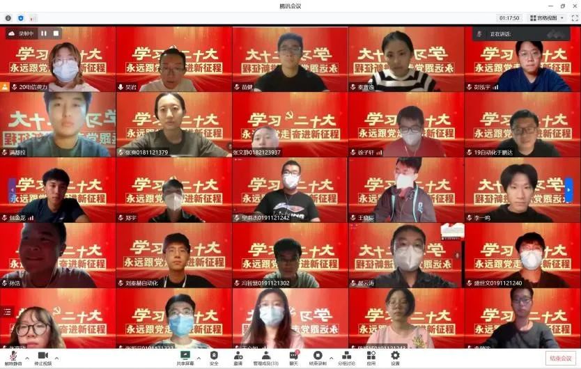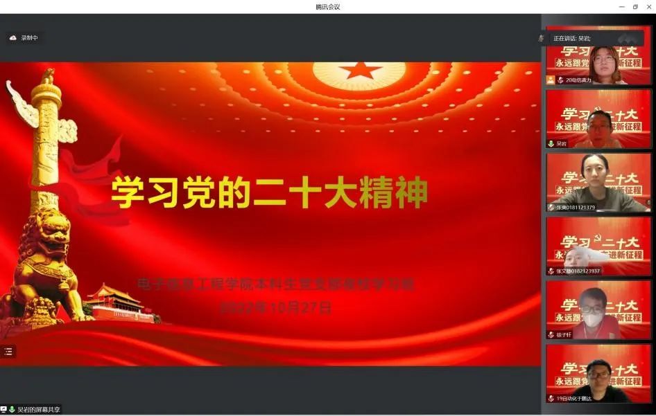 2022年10月27日晚20:00,太阳集团tyc9728本科生党支部夜校在腾讯会议开展党的二十大精神专题学习活动,本科生党支部书记吴岩主持会议,全体本科生党员参加会议。