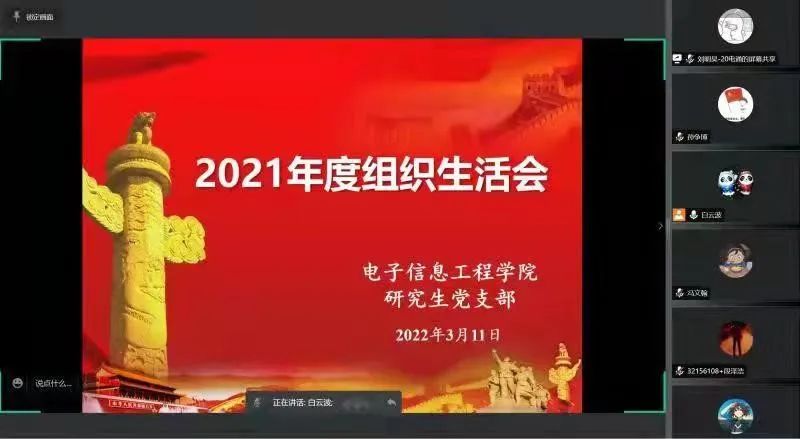 3月11日19:00,学院研究生党支部通过腾讯会议召开了2021 年度组织生活会。会议由研究生党支部书记白云波主持,全体研究生党员参加了会议。