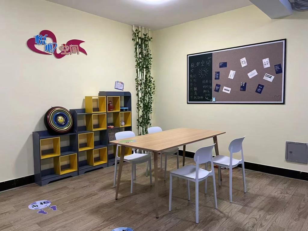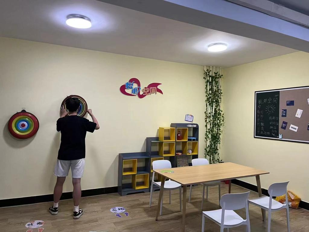“悦心空间”设在2号楼2楼,整体色调温暖明亮,给人以温馨放松的感觉。“悦心空间”设有书籍漂流角、情绪宣泄器材、减压玩具、倾诉墙等,同学们可以在这里看书、玩游戏、倾诉烦恼、宣泄情绪,暂时从忙碌紧张的学习生活中抽离,享受片刻放松与安逸,在这里整理思绪,为心灵充电。