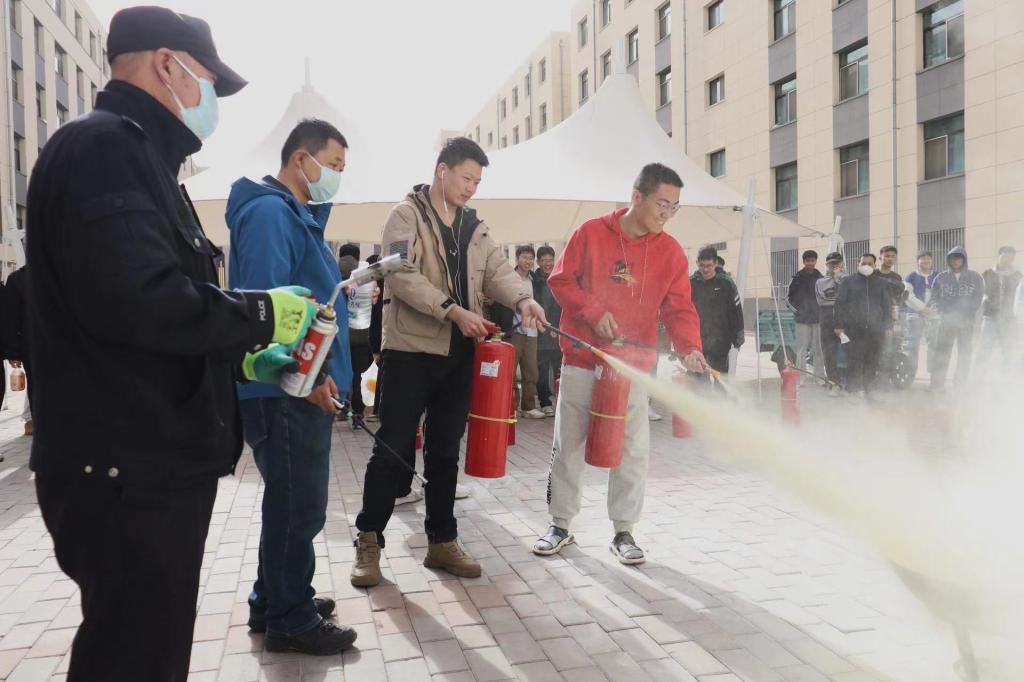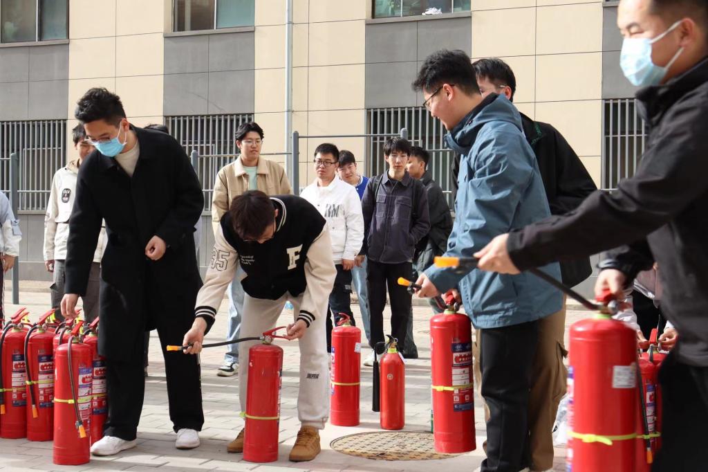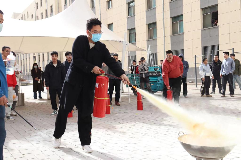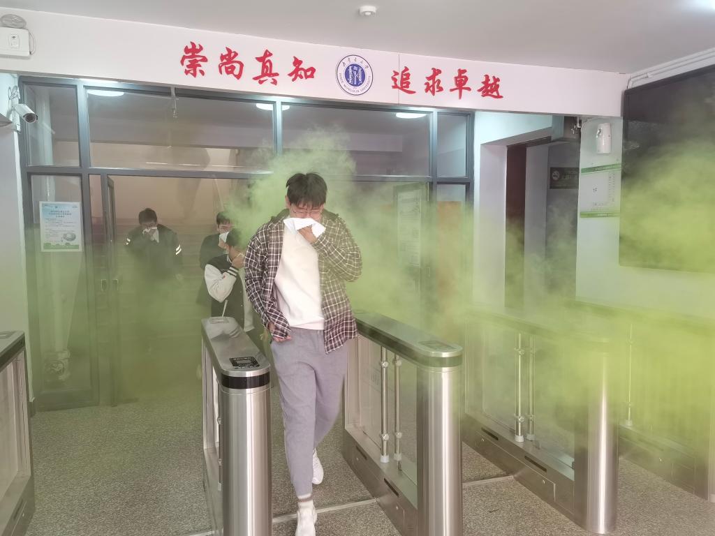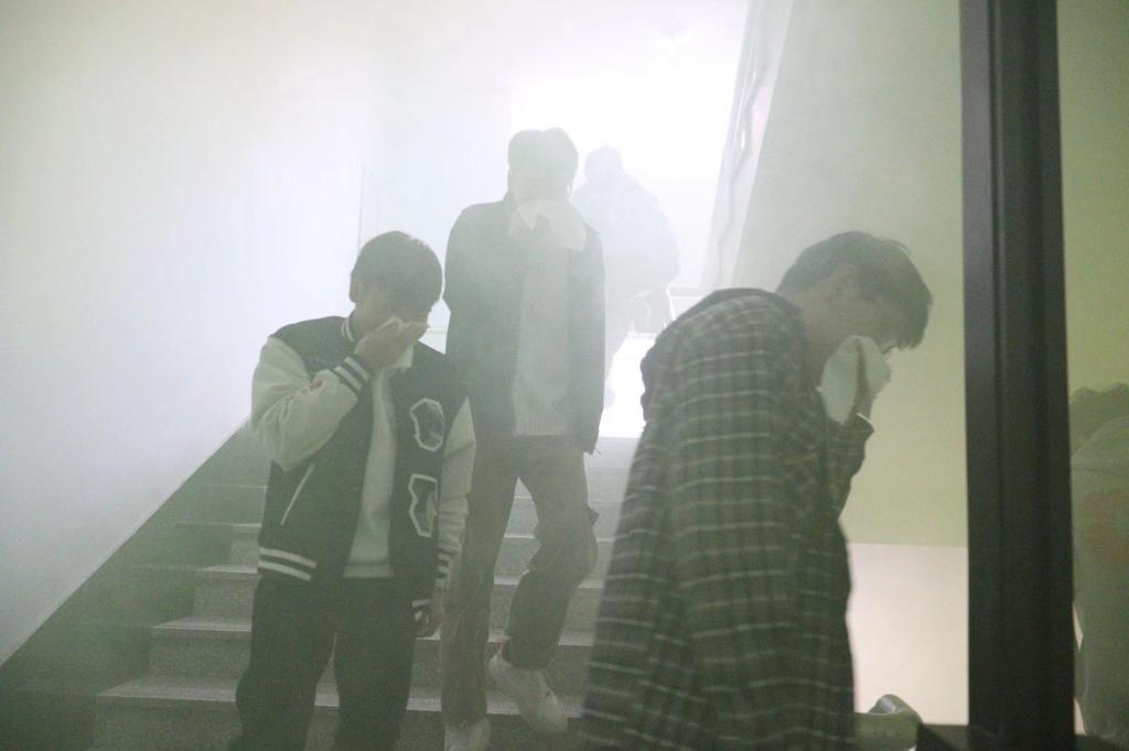 下午4点,在演练开始前,工作人员在2号公寓楼内燃放4枚烟雾弹。随着警报声响起,楼内学生用湿毛巾捂住口鼻,在辅导员老师、楼长、工作人员的带领下,有序疏散到公寓楼外安全地带。随后,保卫处工作人员向师生们详细介绍了灭火器种类及使用方法,并指导学生开展实际操作。