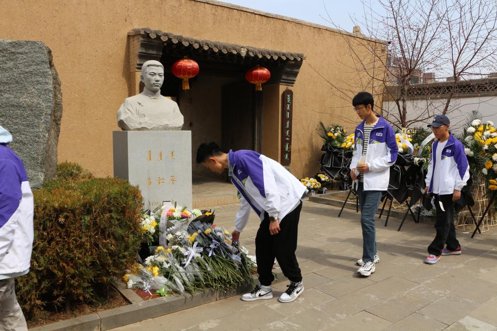 多松年烈士纪念碑前,师生们整齐肃立,集体低头默哀,深切缅怀这位革命先烈。随后,大家排队依次献上寄托哀思的菊花,表达对英雄的无限敬意。