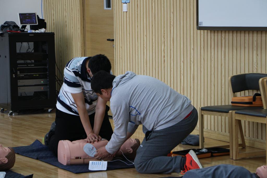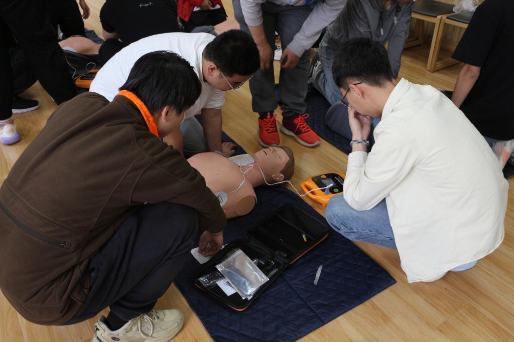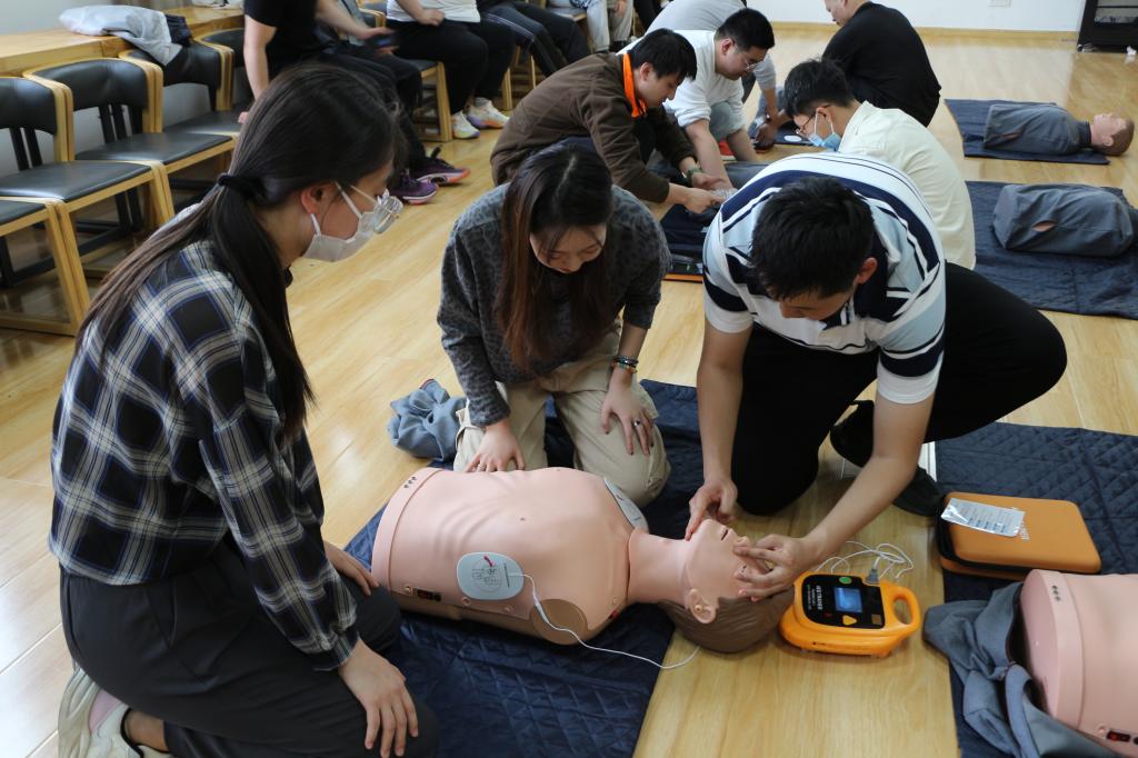 培训过程中,学生们借助模拟人进行实际操作,并熟练地掌握了心肺复苏操作流程中的调整体位、判断呼吸、胸外按压、开放气道、人工呼吸、AED使用等技术要领。